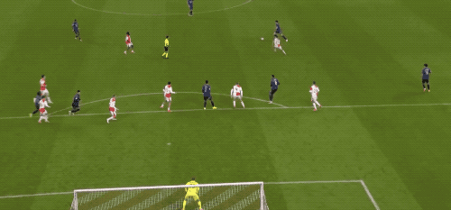 第23分钟,接到赖斯的直塞,萨卡高速插上,抵住防守球员小角度射门,门将稳稳将球挡出。